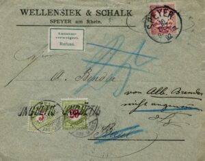 Brief 1: Ein unterfrankierter Brief vom 16. Dezember 1892 der bekannten Speyerer Zigarrenfabrik „Wellensiek & Schalk“ nach Basel. Auf der Schweizer Auswechselstelle wurde der Fehlbetrag festgestellt und der doppelte Betrag der fehlenden Frankatur, aufgerundet auf volle 5 Rappen, also 25 Rp. nachtaxiert. „Von Alb. Bender nicht an genommen“ schrieb der Postzusteller als Begründung der Annahmeverweigerung auf den Brief. Auf der Schweizer Auswechselstelle wurde der Klebezettel „Annahme verweigert. Refusé.“ aufgeklebt. Die Nachportomarken wurden mit dem Stempel „UNGÜLTIG“ für nichtig erklärt. Der Brief lief zurück an den Absender in Speyer, wo er laut rückseitigem Ankunftsstempel am 18. Dezember 1892 an kam. Die Firma „Wellensiek & Schalk“ musste den Brief überneh men und das fehlende Porto nachzahlen.