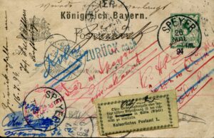 Brief 2: Postkarte P38/07x vom Mai 1894, von Speyer nach München gesandt. Der Adressat konnte dort nicht angetroffen werden. Auf der Rückseite wurde mit Bleistift „Adressat ein Bildhauer hat sich am 11. Juli nach Cöln abgemeldet“ notiert und auf der Vorderseite mit roter Tinte „Jetzt in Cöln“. Die Karte lief nach Köln. Dort wurde nach vergeblicher Suche schriftlich vermerkt „Wurde nicht abverlangt“. Es wurde ein gelber Klebezettel des Kaiserlichen Postamtes 1. angebracht, dazu der Stempel „ZURÜCK nach“ (Speyer), und die Postkarte lief nach Speyer. Dort notierte der Briefträger: „Zurück erhalten am 16.7.94“. Nach erfolgloser Nachforschung wurde auf der Karte in roter Schrift vermerkt: „Absender in Speyer unbekannt“. Mit dem Speyerer Poststempel vom 24.7.1894 wurde die Postkarte wiederum auf den Weg nach Köln gebracht, wo sie am 25. Juli 1894 ankam und vermutlich den Bildhauer erreichte – oder nicht! Speyer oder Köln wo wurde die blaue Kölner Adresse links unten notiert?