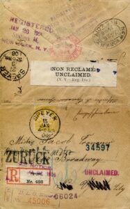 Portorichtiger Einschreibebrief vom 15. Januar 1908 an Herrn Jakob Cronauer nach New York City. In N.Y. kam der Brief am 25.1. an und wurde am 26.1. auf der Station M in New York eingeschrieben. Da er „UNCLAIMED“ = unzustellbar“ war, wurde New York wurde mit schwarzem Stift durchgestrichen, und der Brief landete beim „DEAD LETTER OFFICE“, dem Amt für unzustellbare Briefe. Dort erhielt er nach einer Aufbewahrungszeit den Auf kleber „(NON RECLAMÉ) UN CLAIMED (N.Y.Reg.Div.)“ und wurde nach Speyer zurückge sandt, wo er am 27. März 1908 ankam. Eine Begründung für die Unzustellbarkeit war nicht auszumachen.