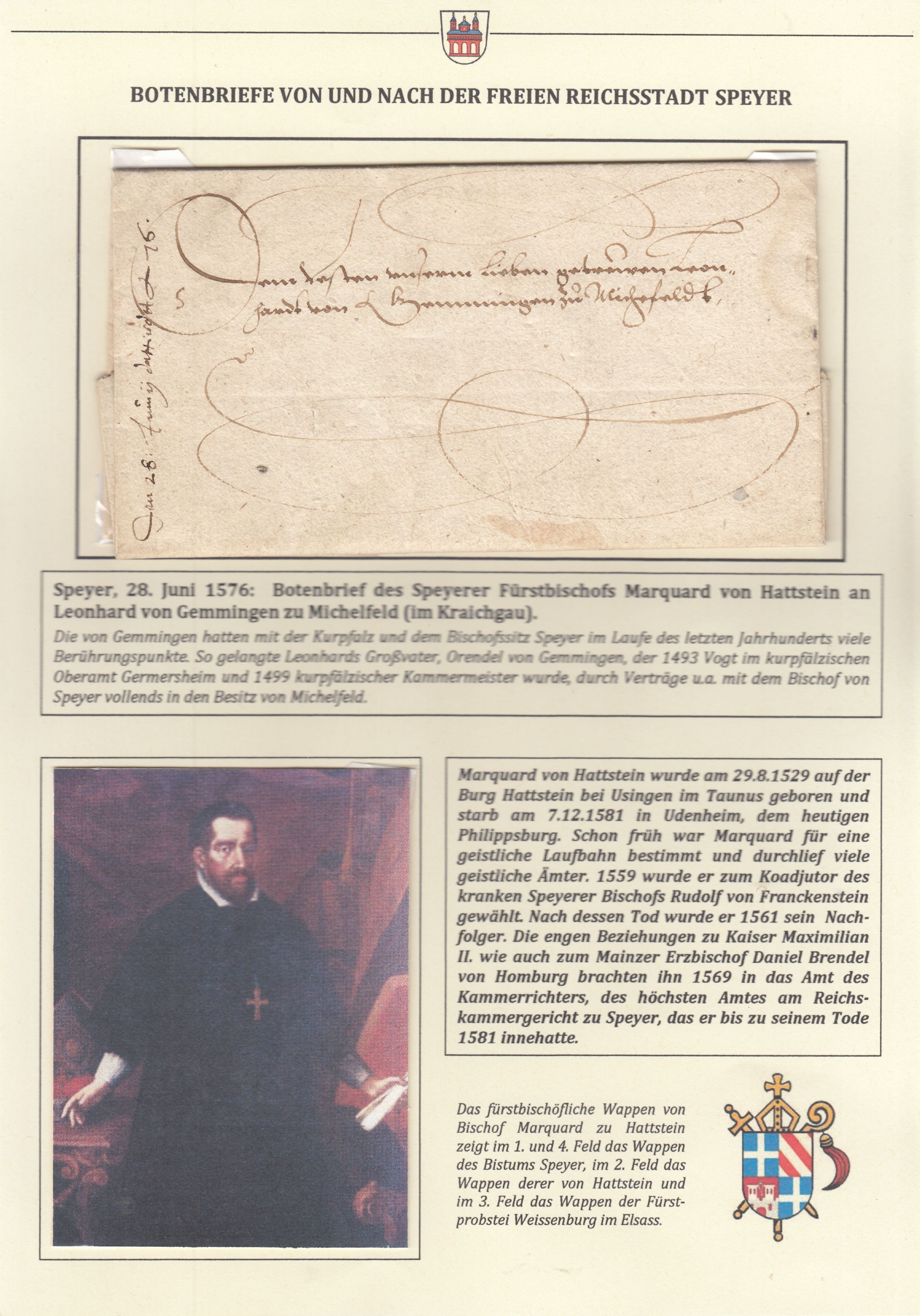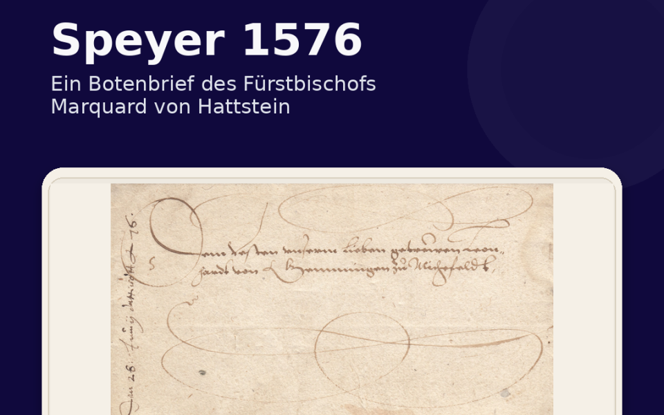 Am 28. Juni 1576 wurde in Speyer ein Botenbrief des Speyerer Fürstbischofs Marquard von Hattstein an Leonhard von Gemmingen zu Michelfeld im Kraichgau verfasst. Bereits diese knappe Zuordnung verleiht dem Stück besonderes Gewicht. Der Brief ist nicht nur ein bemerkenswert frühes Zeugnis der Speyerer Geschichte, sondern zugleich ein Hinweis auf die Bedeutung der Stadt im 16. Jahrhundert.