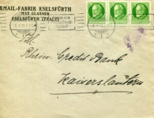 1. April 1920: Ortsbrief „Kaiserslautern“ vom Ersttag der Reichspost Hoheit in der bayerischen Pfalz, mit drei mal 5 Pfg. „Ludwig“ (Mi Nr. 95) als Nachverwendung richtig frankiert. Geschrieben wurde der Brief in Eselsfürth.