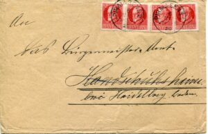 6. Mai 1920: Vom Ersttag der Portoerhöhung, einfacher Fernbrief von Pirmasens an das Bürgermeisteramt in Heidelberg (Handschuhsheim wurde gestrichen) aus der Reichspost Hoheit, mit reiner Ludwig Nachverwendung Mi Nr. 96 (4 x 10 Pfg.) richtig frankiert. Der Brief im Fern verkehr kostete jetzt 40 Pfg.