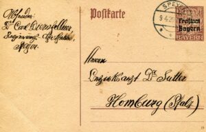 9. April 1920: Bayerische Postkarte P114I, jetzt unter der Reichspost Hoheit.