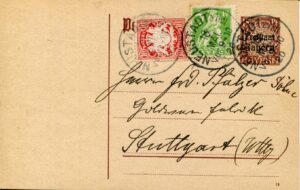 Die bayerische Abschiedsausgabe wurde jedoch nicht schlagartig ungültig, sondern ihr wurde noch eine Verwendungsdauer von drei Monaten bis zum 30. Juni 1920 gewährt. Das galt auch für die übrigen damals gültigen bayerischen Briefmarken „Ludwig“ (MiNr. 94115), „Ludwig/Volksstaat“ (MiNr. 116135) und „Ludwig/ Freistaat“ (MiNr. 152176). Weiter verwendet konnten auch die sog. Aufbrauchausgaben, das sind die 3 Pfg. (MiNr. 60), die 5 Pfg. (Mi Nr. 61 und 75) und die 10 Pfg. (MiNr. 56) der bayerischen Wappen ausgaben, die seit 28. Januar 1920 wieder gültig waren. Auch die Aufdruckmarken 20 auf 3 Pfg. braun (MiNr. 177) durfte bis zum 30. Juni 1920 verwendet werden. Für die bayerischen Ganzsachen galt die Übergangszeit nur bis 31. Mai 1920, einen Monat kürzer als für die Marken. Doch sie konnten bis zum 31. Oktober 1921 gegen Reichspostwertzeichen eingetauscht werden. Bayerische Marken hatten wir also nur bis zum 31. März 1920, ab 1. April 1920 waren die bayerischen Marken „Reichspostmarken“.